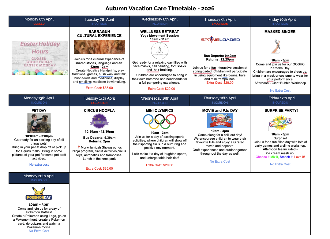 Tuesday 14th April 2026 - EXCURSION - Circus Hoopla - Murwillumbah Showgrounds – Ensure your child is wearing enclosed shoes and suitable clothes for circus school. Please provide a packed lunch, morning tea, lunch and afternoon tea, a water bottle, a change of clothes and a hat. We will be having lunch at the murwillumbah knox park- after Circus Hoopla.
